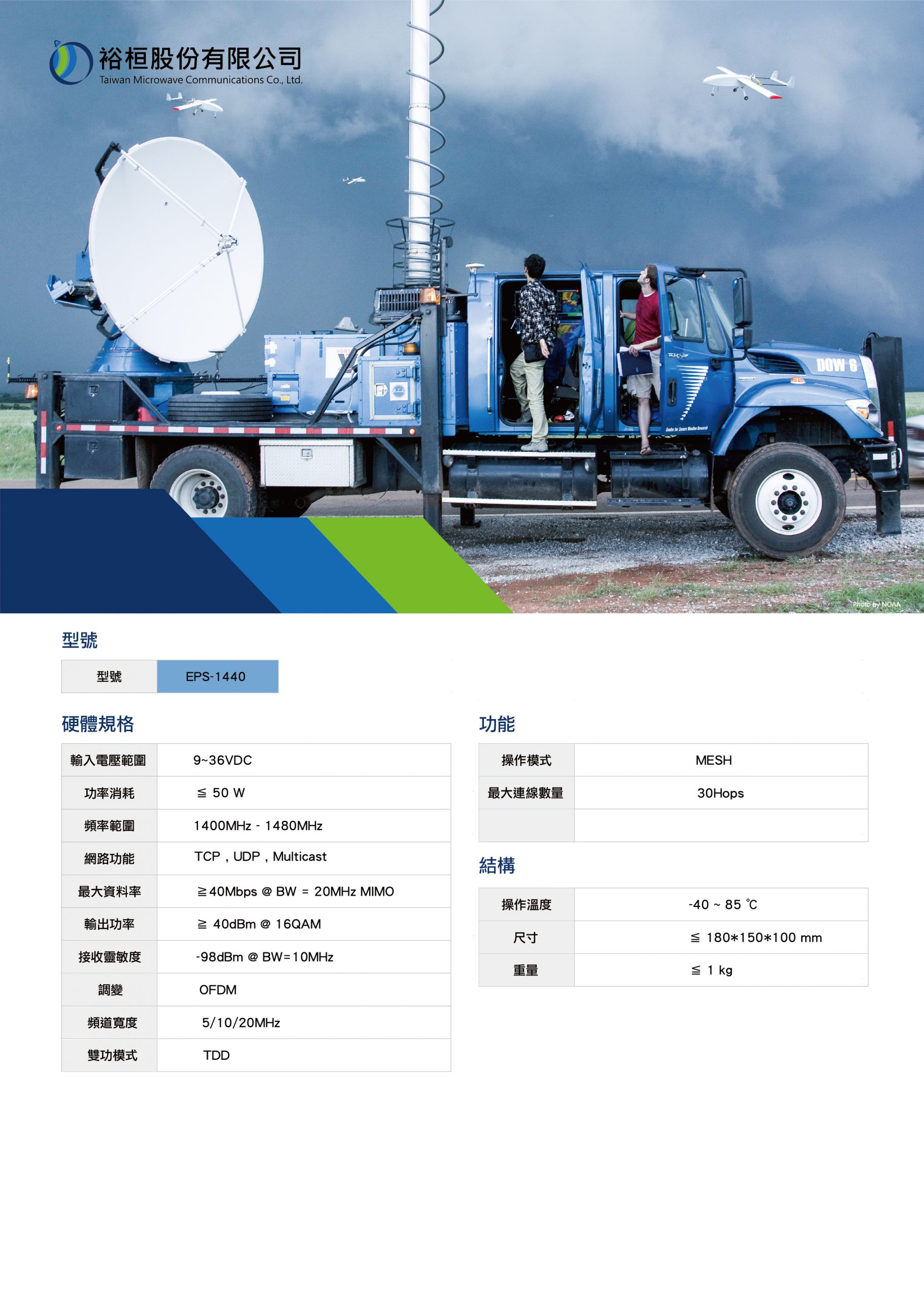 EPS-1440 EPS-1440是一款高性能無線 MESH網絡設備。 無線節點可以自行配置網絡也可以自動修復網絡故障使整體性能優化。該設備利用高級演算法以提高吞吐量和低時間延遲產品特點:* 通過設定窄頻帶寬度和發射功率可以進行長距離通訊* 可自行透過備用鏈路連接原始網絡* 可自行透過高增益天線和發射功率延長距離* 支援將網橋添加到MESH協議規則中。 型錄下載